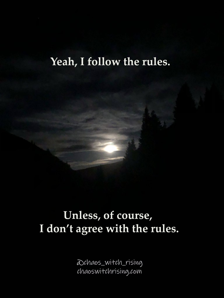 I can’t really talk about breaking rules without talking about sacred disruption. What I mean by “rules” is somewhat vast—I mean rules imposed on us from the outside (society, religion, the government, work and relationship expectations) and the inside (personal habits, routines, beliefs, coping mechanisms). Sacred disruption is on par with sacred rage. Without it, nothing ever changes.