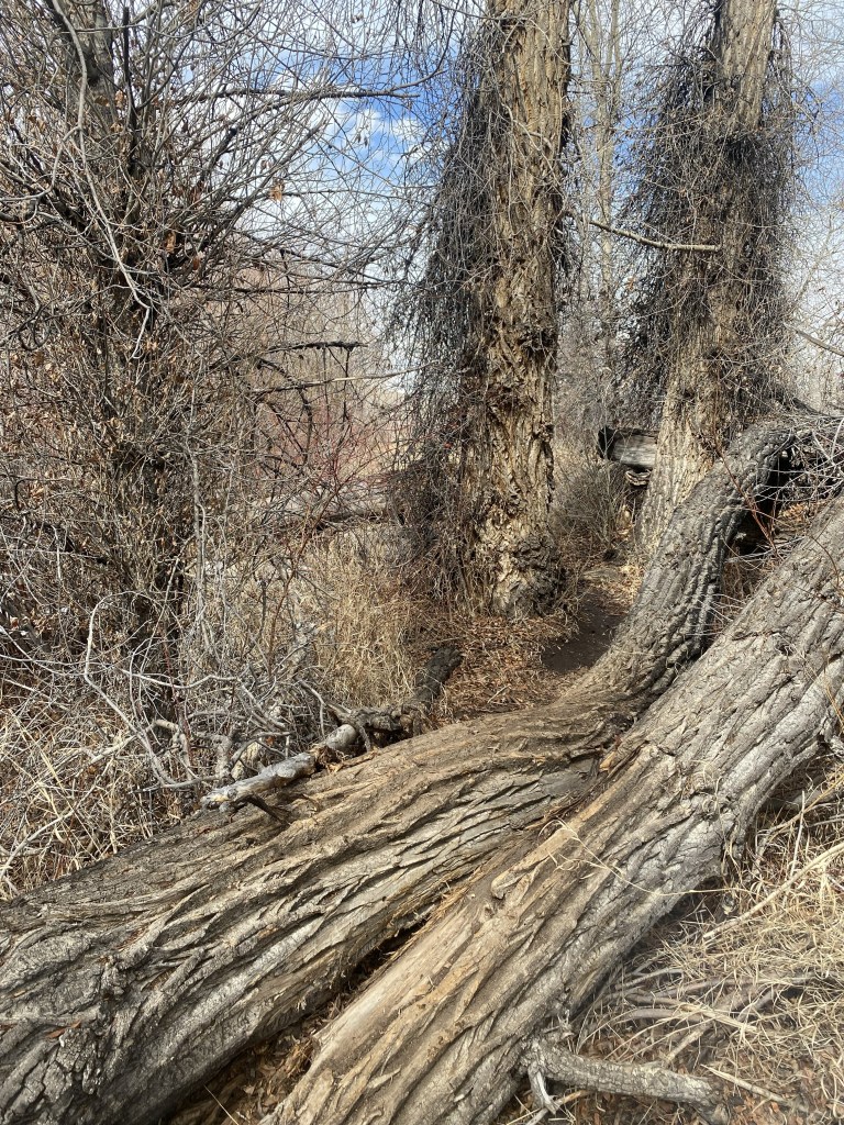 As I trudged through the mud of yesterday’s downpour, my heart whispered, “keep going.” I had my doubts as I looked ahead. The path appeared blocked, impassable, a dead end. The wind blew wildly, drying the earth with each audacious gust. The shushing sound of dancing, yellowed reed grass entranced me. The creaking, moaning stretches of old cottonwood trees haunted me in a delightful way. One lone red willow tree stood solemnly in defiance, and I knew I must be close. The rhythmic three-note songs of red-winged blackbirds beckoned me farther. I balanced my way across the fallen, ashy branches of watchful aspens, so timid with my steps, so afraid to fall.
